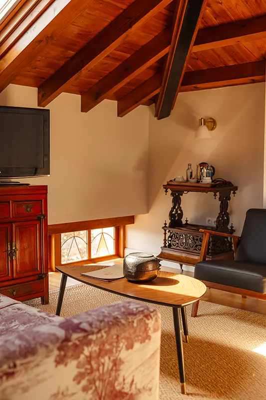 Es un espacio ideal para leer, conversar, tomar un café o simplemente dejarse envolver por la serenidad que ofrece el entorno. La decoración cálida y el ambiente acogedor completan un lugar que, más que una sala común, es un refugio donde detener el tiempo y contemplar la grandeza del paisaje asturiano.